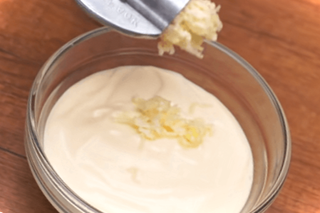Крок 2. До майонезу додаємо часник, пропущений через прес або часнику. Добре перемішуємо, а потім перекладаємо масу кондитерський мішок. Якщо мішка немає в господарстві, тоді перекладіть соус у чистий (новий) поліетиленовий пакет і відріжте невеликий куточок.