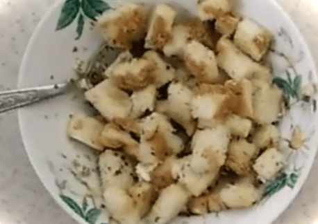 Крок 2. Хліб ріжемо невеликими кубиками. Перекладаємо в миску, посипаємо їх прованськими травами. Додайте до них пропущений через прес часник та 1 ст. л. рослинної олії та 1 ст. л. соєвого соусу. Перемішайте і теж залиште поки що на 5 хвилин, щоб хлібчик просочився ароматом трав.