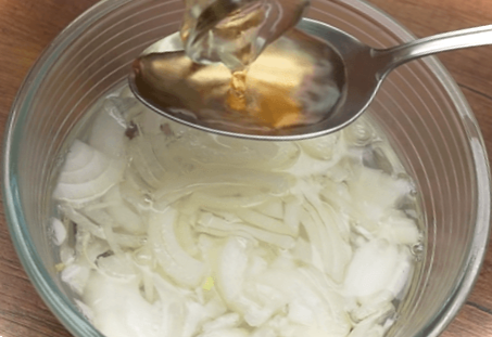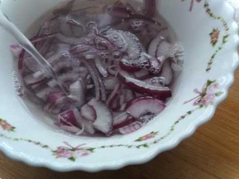 Замість білої цибулі ви можете взяти червоний колір, він також буде виглядати не менш красиво в готовому страві.Ми покладаємо нарізану цибулю в невелику миску, додаємо 0,5 години. л. Сіль, 1 година. л. цукор і виливає окропу і 2 т. л. оцет. Перемішати так, що сіль і цукор розчиняються у воді. Залиште його, щоб пікл на 15 хвилин.
