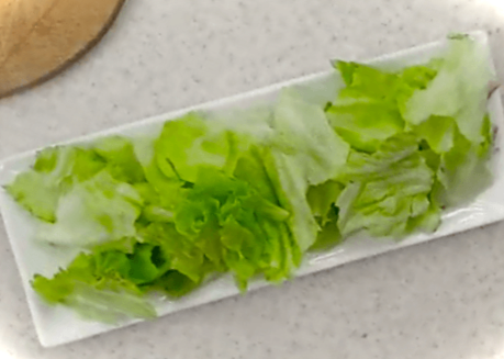 Крок 6. Збираємо салат. На дно плоскої тарілки листя салату Айсберг, порвавши їх руками дрібними шматочками. До речі, листя Айсберга можна замінити листочками пекінської капусти, які теж потрібно порвати руками.