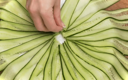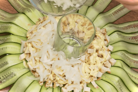 Крок 6. Тепер із середини салату прибираємо склянку і загортаємо до центру скибочки огірка. Починаємо загортати їх з останньої покладеної смужки.