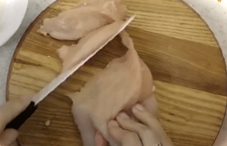 Крок 1. Зачистіть філе від жиру та нерівних шматочків. Наріжте акуратно його скибочками однакової товщини.