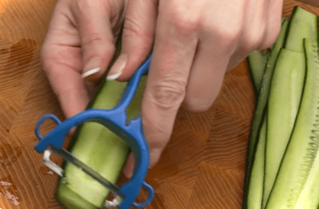Крок 2. У той час як цибуля маринована, тим часом, нарізати тонкими шматочками - ковзання з овочами свіжих огірків. Якщо якісь смужки лопнуть - це нормально, вони все одно будуть займатися бізнесом.