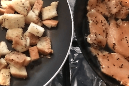 Крок 4. На окремих сковородах обсмажуємо куряче філе та грінки. Масло додавати не потрібно, оскільки під час маринування його вже додавали.