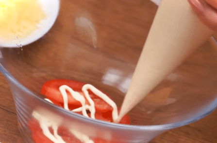 Крок 3. На дно салатника укладаємо шар помідорів, злегка посипаємо меленим перцем, а потім зверху покриваємо сіточкою з майонезу (видавлюємо з мішка кондитерського).