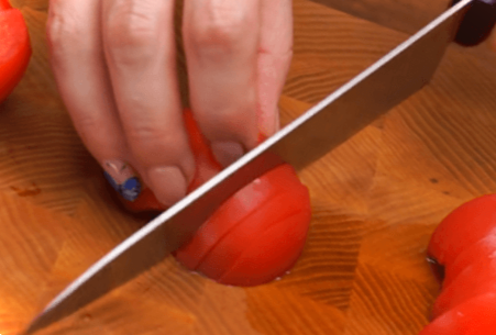 Помідори розрізаємо навпіл, вирізаємо в кожній половинці плодоніжку, а потім нарізаємо тонкими рівними скибочками.