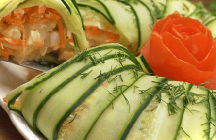 Незвичайне оформлення цього салату стане окрасою будь-якого святкового столу. І готується він дуже просто і з доступних продуктів. Цей салат теж виходить листковий, проте шари будуть прикриті смужками огірків. І ви в це самі зараз переконаєтесь.