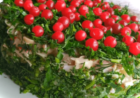 Приготуйте на святковий Новорічний стіл такий салат. У складі є гриби, шлях і мариновані, а окрасою будуть лісові ягоди та зелень. Начебто ви побачили клаптик лісу у себе на столі. Було б чудово, якби замість курячого м'яса в салаті була б дичина. Якщо у вас є в сім'ї мисливці, то залиште для такого випадку м'ясо глухаря чи рябчика. Ось вже воістину буде царська страва!