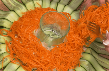 Потім по колу викладаємо шар корейської моркви. Якщо ви не змогли купити готову, то приготуйте її самі за цим рецептом.