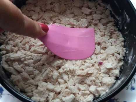 Щоб майонезу багато не виявилося, видавлюйте його тонким струмком з кондитерського мішка.2-й шар - відварене куряче м'ясо подрібнюємо за допомогою блендера. Укладаємо м'ясо у форму, розрівнюємо, покриваємо майонезом.