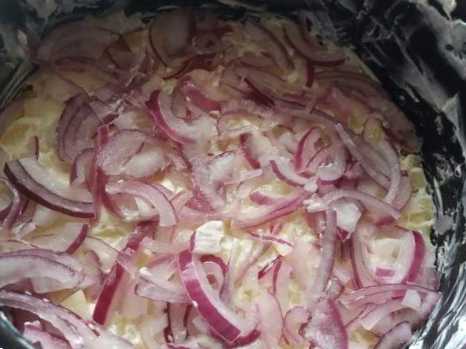 Наступний шар - маринована цибуля. З нього попередньо зливаємо рідину. І злегка віджимаємо.