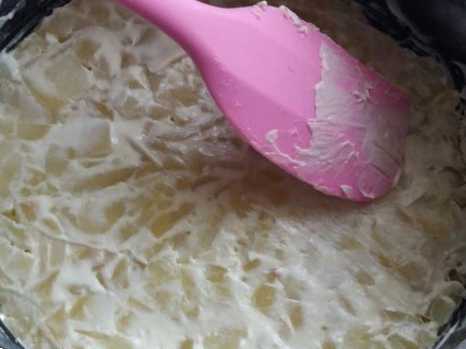 Крок 3. Варену картоплю нарізаємо дрібними кубиками. Складаємо картоплю у форму, і ложкою або силіконовою лопаткою вирівнюємо її, злегка ущільнюючи. Змащуємо майонезом.