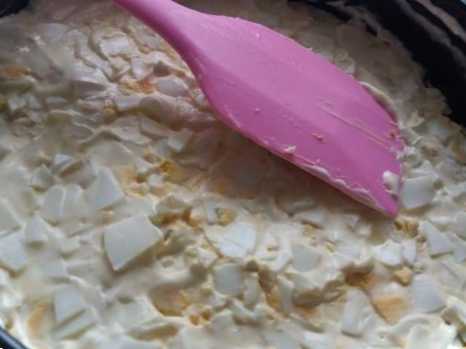 Крок 5. Дрібними шматочками нарізаємо варені яйця. І теж їх викладаємо у форму, це буде вже наступний здань. Вирівнюємо шар із яєць і змащуємо майонезом.