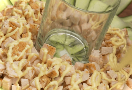 По середині тарілки ставимо перевернуту склянку. Навколо нього викладаємо шар нарізаного кубиками курячого філе. Зверху покриваємо сіточкою майонезу.