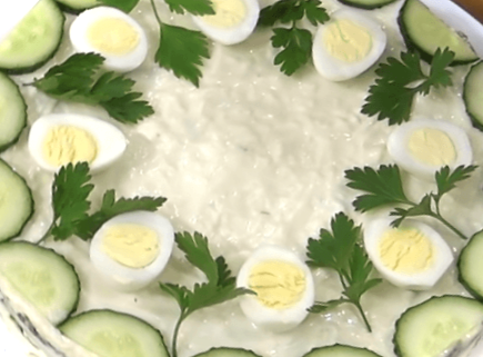 Щоб воно добре знялося і не пошкодило стінки салату, злегка поверніть обручку вбік і акуратно піднімайте форму вгору.Прикрашаємо скибочками огірка, половинками перепелиних яєць та листочками петрушки.