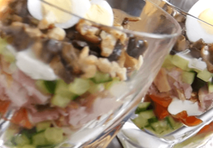Приготуйте дуже смачний і ніжний салат з шинкою та грибами. Тут також у складі є куряче м'ясо та яйця, так що страва вийде ще й досить ситною.