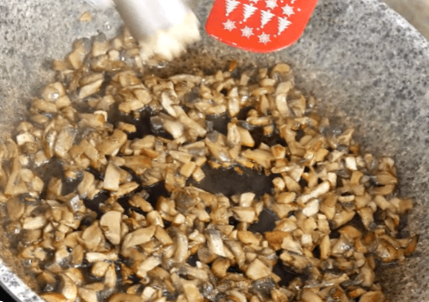 На сковороді обсмажуємо дрібно нарізану цибулю, потім до цибулі додаємо нарізані шматочками гриби, обсмажуємо їх разом.