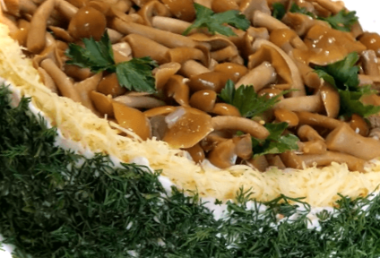 Листковий салат "Веселі опеньки" з маринованими опеньками та куркою