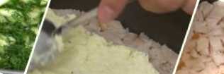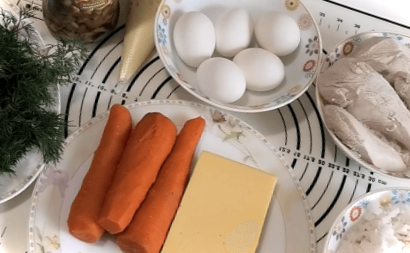 Заздалегідь відваріть курячі грудки, рис, морква. Курячі грудки краще класти відразу в киплячу воду і варіть її 20-25 хвилин з додаванням чорного перцю і лаврового листа. Залишіть остигати м'ясо в бульйоні, інакше воно покриється скоринкою і підсохне.