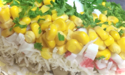 3 шар - консервована кукурудза. Її попередньо викладають на друшляк, щоб стекла зайва рідина. Кукурудзяний шар викладаємо завтовшки в 1 зернятко. Злегка притискаємо і робимо тонку сіточку з майонезу.