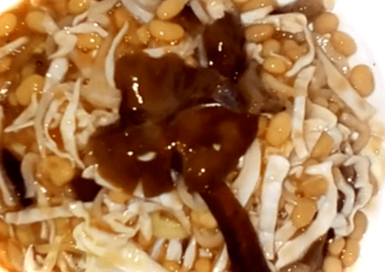 Цибулю нарізають півкільцями, трохи розминають його руками, солять і перчать до смаку. Капусту дрібно шаткуємо. Змішуємо всі інгредієнти. До цибулі додаємо капусту, мариновані опеньки, квасолю разом з томатним соусом (соус з квасолі не зливаємо). Заправляти більше нічим не треба. Все перемішуємо, викладаємо в салатник і подаємо на стіл.