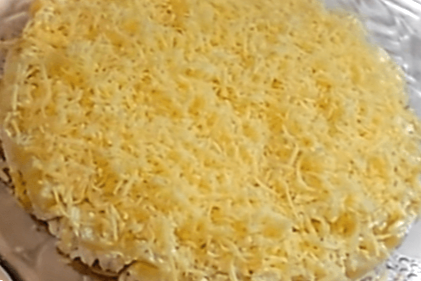 5 шар - сир, натертий на середній тертці. Постарайтеся його розтягнути так, щоб по краях шар сиру був товстіший, ніж посередині, формуючи тим самим бортики по краях. Покриваємо сіткою з майонезу, бортики із сиру майонезом не покриваємо.
