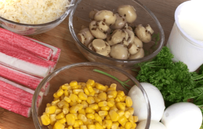Рецепт салату з маринованих грибів, крабових паличок та сиру
