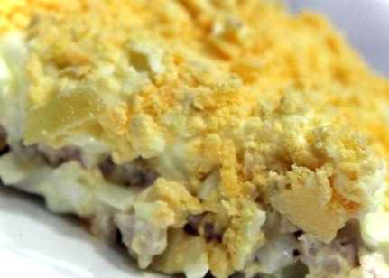 [message]Якщо вам здасться, що салат виходить сухуватим, тоді кожен шар промазуйте трохи майонезом. Заберіть ненадовго готову страву в прохолодне місце, щоб він добре просочився.[/message]