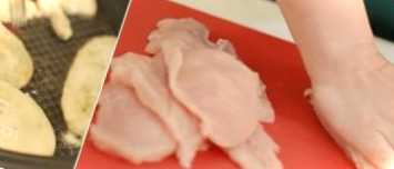 Куряче м'ясо розрізаємо на тонке філе завтовшки 0,5 см. Кожен шматок солимо і перчимо. У сковороду наливаємо трохи рослинної олії і обсмажуємо філе спочатку з одного боку, як тільки філе почне біліти, перевертаємо його і смажимо з іншого боку. Готову курку прибираємо зі сковороди на окрему тарілку, щоб м'ясо охололо.