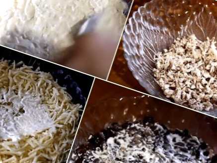 5 шар - натертий сир. Але сиром можна посипати відразу в кільці, прикрийте кільце харчовою плівкою і заберіть страву в холодильник для просочування. Або, прокрутивши кільце трохи убік і розстебнувши його, обережно зняти кільце, і вже після цього посипте сиром. Якщо салат подаєте відразу ж на стіл, відразу посипте його натертим сиром.