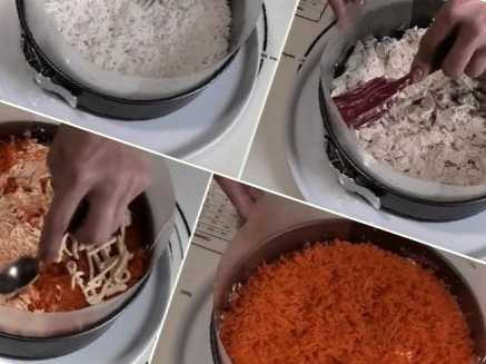 Красивий та апетитний салат готується легко, з доступних продуктів і не потребує додаткової прикраси. За бажання шари можна поміняти, наприклад, додавши мариновані огірки або замінивши рис відвареною картоплею. А курку можна замінити будь-яким іншим м'ясом чи ковбасою.
