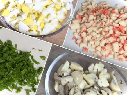 Крабові палички нарізаємо дрібними шматочками. Замість них можна взяти відварені та очищені креветки. Яйця також нарізаємо кубиками. Мариновані печериці нарізаємо на 2-4 частини залежно від величини. Кілька гілочок залишаємо для прикраси салату, а решту зелені дрібно рубаємо ножем.