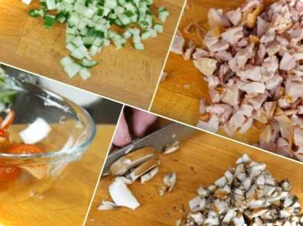Нарізаємо невеликими кубиками курку та огірки, помідори чері нарізаємо на 4-6 частин залежно від їх величини. Печериці нарізаємо невеликими кубиками і відправляємо смажитися на сковороду з олією. Гриби при жарінні сильно зменшаться, тому беріть їх відразу побільше.