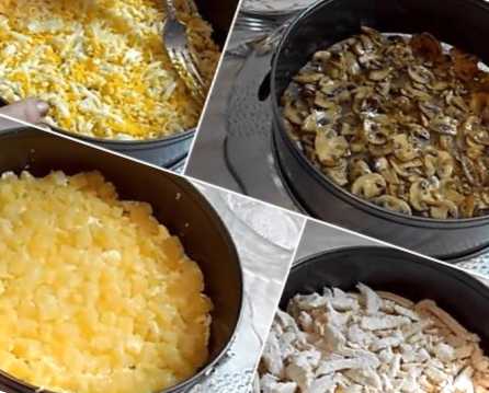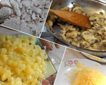 Приготуйте на свято дуже смачний і ситний салат із грибами, куркою та ананасами. А часточки ананасами принесуть страви солодку нотку. Найкраще його готувати в рознімному кільці, хоча шари можна скласти і без кільця.