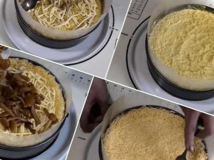 4 шар - охолоджені смажені гриби. Розподіляємо їх по всій поверхні у формі невеликої гірки, злегка їх утрамбовуємо, щоб салат тримав форму. Зверху покриваємо тонкою сіточкою з майонезу.