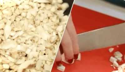 Замість свіжих можна взяти консервовані чи мариновані гриби. Але спершу з них потрібно злити через друшляк рідину.Нарізаємо тонкою соломкою або невеликими шматочками курячу грудку.