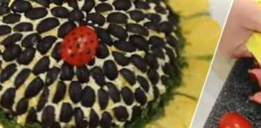 - З чері робимо сонечка. Розрізаємо чері навпіл, внутрішню частину змащуємо невеликою кількістю майонезу, щоб вона закріпилася і викладаємо їх нагору. З шматочка маслини робимо голівку, крапельками майонезу малюємо їй очі. З бальзамічного оцту робимо цятки на спинці.