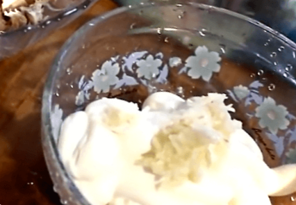 Яйця натираємо на дрібній тертці, додаємо 3-4 ст. л. майонезу, перемішуємо.