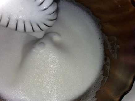 Дістаємо білки з холодильника і починаємо їх збивати у круту піну. Можна скористатися міксером, але мені подобається краще збивати віночком, та й за часом це анітрохи не довше будемо, ніж збиваючи міксером. За часом це займе також не більше 5 хвилин.