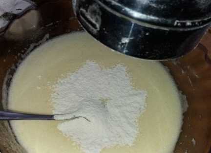 Наступним етапом буде додавання борошна. Борошно можна просіяти заздалегідь, а якщо у вас є кружечка-ситечко (такі в «Магнітах» продають – дуже зручний пристрій!), краще скористайтеся нею. Борошно додають порціями поступово, щоразу обережно, щоб не зруйнувати білкову піну. У цей же момент можна додати за бажанням ванілін, але це не обов'язково.
