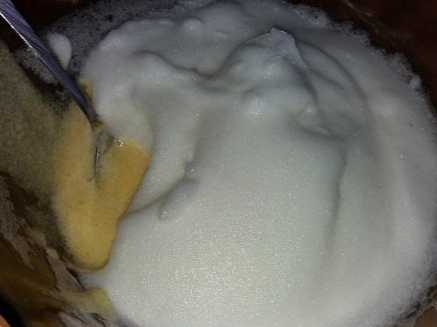 До збитих білків, щоб вони не осіли, по краю чашки додаємо розтерті з цукром жовтки, акуратно їх з'єднуємо разом.