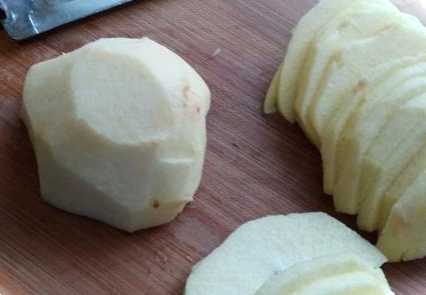Промиті яблука очищаємо від серединки та шкірки, нарізаємо тонкими скибочками.
