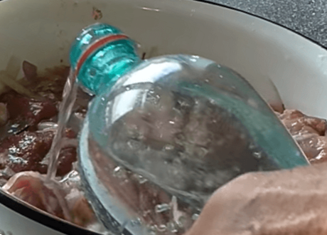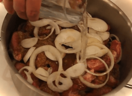 1 ст. л. оцтової есенції розводимо в склянці води, розмішуємо та отриманим розчином заливаємо м'ясо з цибулею в каструлі.