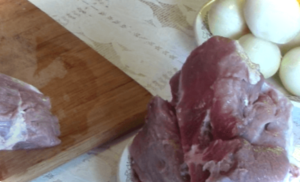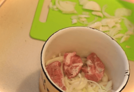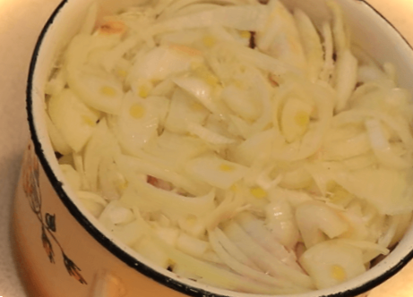 Насамперед нарізаємо кільцями або півкільцями цибулю, складаємо її поки що в окрему миску. Свинину нарізаємо шматочками. А потім у каструлю цибулю та м'ясо перекладаємо шарами.