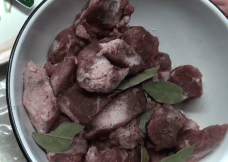 Свинину нарізаємо невеликими шматками, складаємо в каструлю. Солимо його і перчимо, додаємо подрібнені листочки лаврового листа, добре перемішуємо, щоб спеції вбралися в м'ясо.