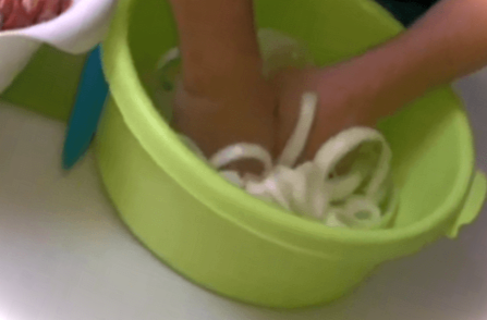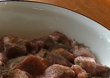 Цибулю ріжемо великими півкільцями, солимо його рясно, щоб він дав сік. Як тільки цибуля дасть сік, відправляємо його до свинини, додаємо приправи і все добре перемішуємо.