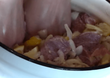 Покладіть у глибоку ємність у шарах: спочатку свинина, сіль і перець її за смаком. Потім викладіть цибулю, а потім лимон, про який ми також пам’ятаємо руками, щоб більше сіків з нього випущений більше. Суміш.