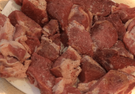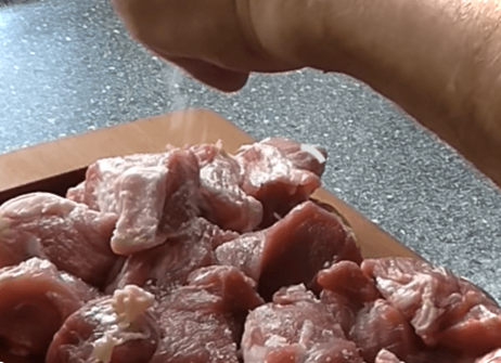 Готуємо продукти. М'ясо нарізаємо невеликими шматками, солимо його та перемішуємо.