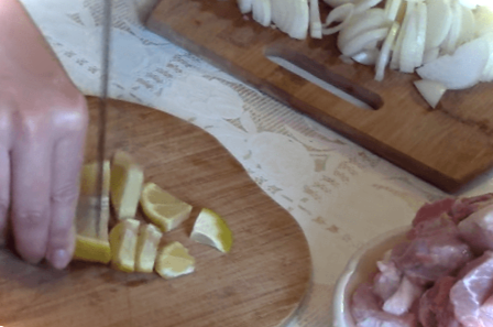 Цей маринад схожий і не схожий на інші, проте додавання лимона анітрохи не зіпсує смаку готової страви. А процес приготування починаємо з нарізки м'яса на невеликі шматки. Окремо нарізаємо цибулю кільцями або півкільцями, трохи приймемо її руками, щоб він дав сік.
