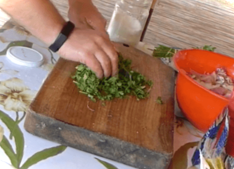 Петрушку дрібно ріжемо і додаємо її до м'яса, разом перемішуємо. Намагаємось сильніше тиснути, щоб і петрушка дала сік.